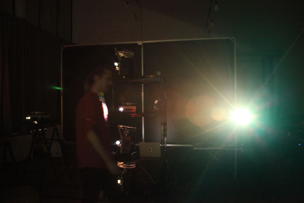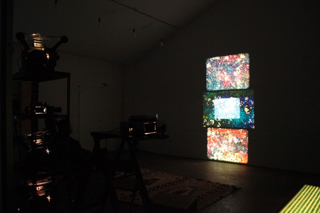 I consider a single frame of film to be as a point in time, an event detached from its surroundings. The filmstrip, on the other hand, is a line, a rapid succession of points that consistently follow each other. The three computer controlled slide projector contain my original points, the hand-painted frames, while the three 16mm projector contain copies of those points that are projected at different rhythms, from top to bottom: 24, 12 and 18. I work with the smallest units of the filmic grammar: filtered light and rhythm. The three different speeds show how the material perceptually changes as a function of time.