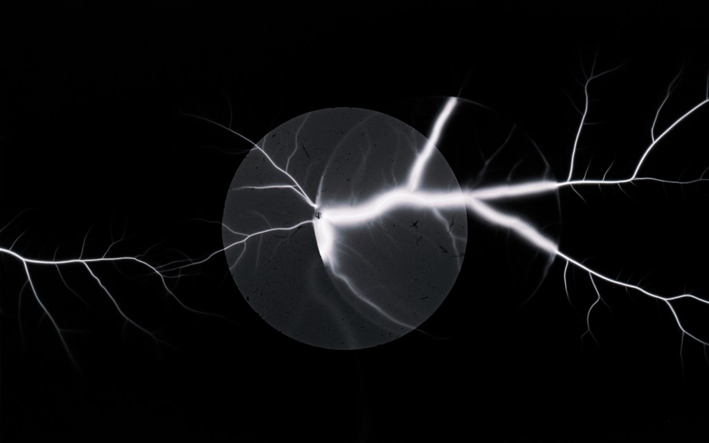 Katabasis is an abstract film that merges analog, camera-less techniques and digital ones such as algorithmic editing. The imagery was created entirely from hand-painted 35mm slides and film exposed to electricity via a Tesla coil—an instrument invented by Nikola Tesla to generate artificial lightning arcs. These same images were then fed into a self-developed algorithm that re-arranges them in real-time according to certain prescribed parameters but without an entirely predictable order, resulting in an editing process that lingers on the border of chaos and control. Echoing the film’s structure and closely adhering to it, the soundtrack was composed from recordings of electromagnetic fields produced by household objects and gongs played by hands, mallets or activated through acoustic feedback alone—without any physical touch involved.